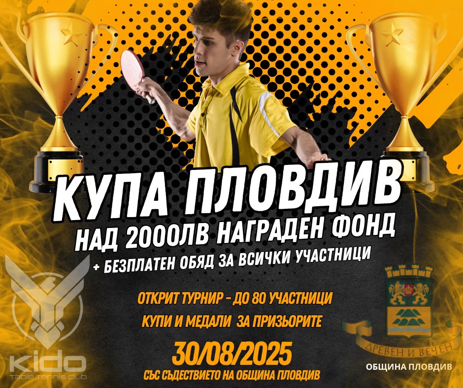 Имаме удоволствието да Ви поканим да вземете участие в националния турнир по тенис на маса „КУПА ПЛОВДИВ 2025“ на 30.08.2025, БЕЗПЛАТЕН ОБЯД, ОСИГУРЕН ОТ ОРГАНИЗАТОРИТЕ ЗА ВСИЧКИ УЧАСТНИЦИ!
