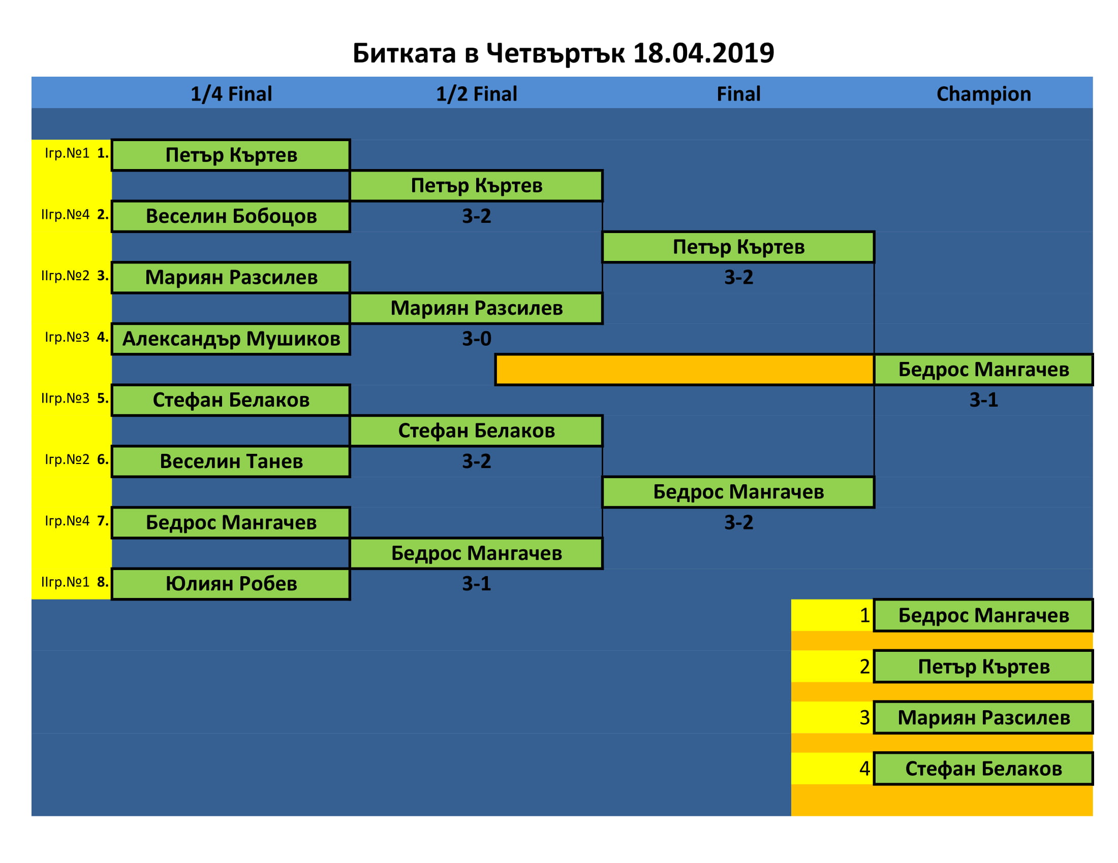 Битката в Четвъртък е състезание, което се провежда ВСЕКИ Четвъртък в залата на клуб КИДО . Този турнир е предназначен за тези, които определят себе си за по-напреднали в тениса на маса. Както и за тези, които искат да проверят уменията си срещу по-силни опоненти.