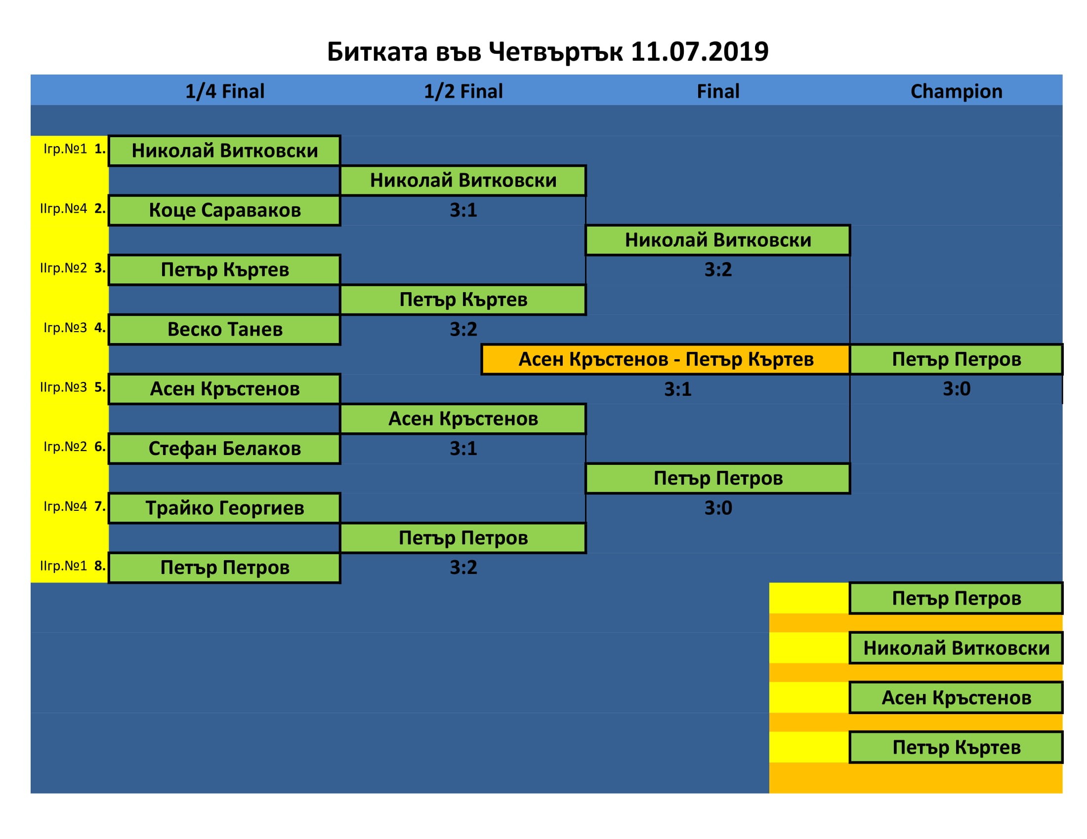 Битката в Четвъртък е състезание, което се провежда ВСЕКИ Четвъртък в залата на клуб КИДО . Този турнир е предназначен за тези, които определят себе си за по-напреднали в тениса на маса. Както и за тези, които искат да проверят уменията си срещу по-силни опоненти.