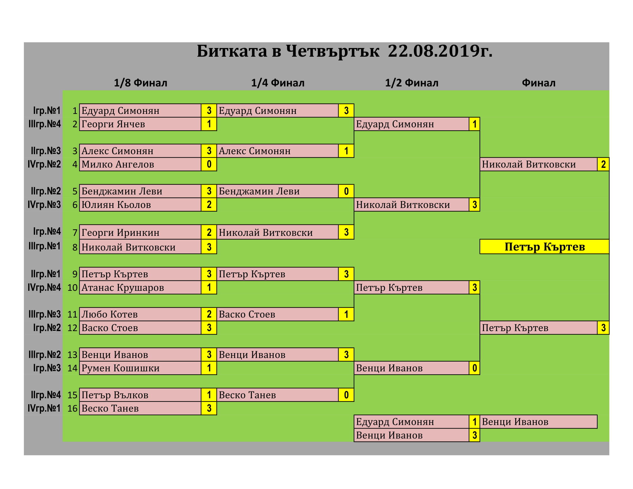 Битката в Четвъртък е състезание, което се провежда ВСЕКИ Четвъртък в залата на клуб КИДО . Този турнир е предназначен за тези, които определят себе си за по-напреднали в тениса на маса. Както и за тези, които искат да проверят уменията си срещу по-силни опоненти.