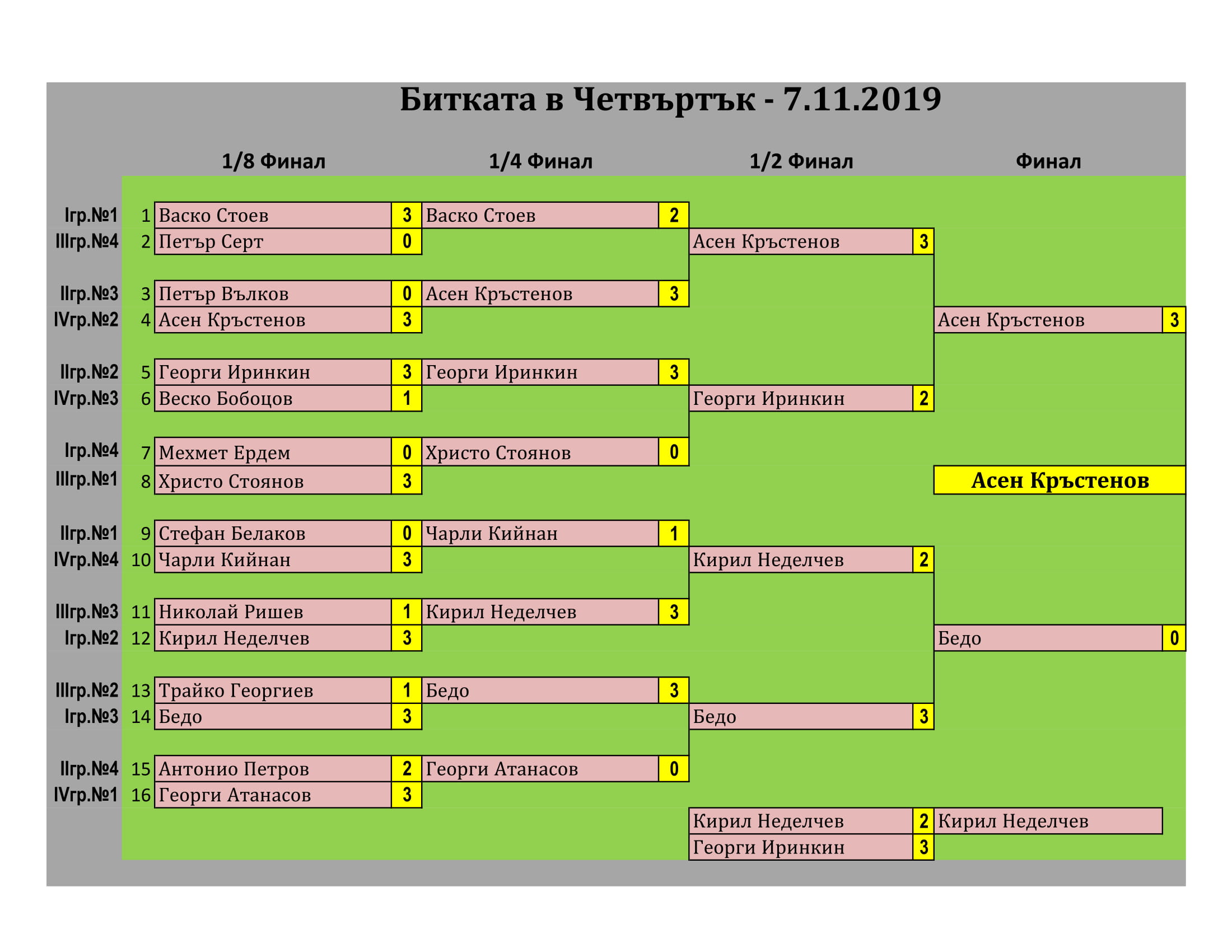 Битката в Четвъртък е състезание, което се провежда ВСЕКИ Четвъртък в залата на клуб КИДО .  Този турнир е предназначен за тези, които определят себе си за по-напреднали в тениса на маса. Както и за тези, които искат да проверят уменията си срещу по-силни опоненти.