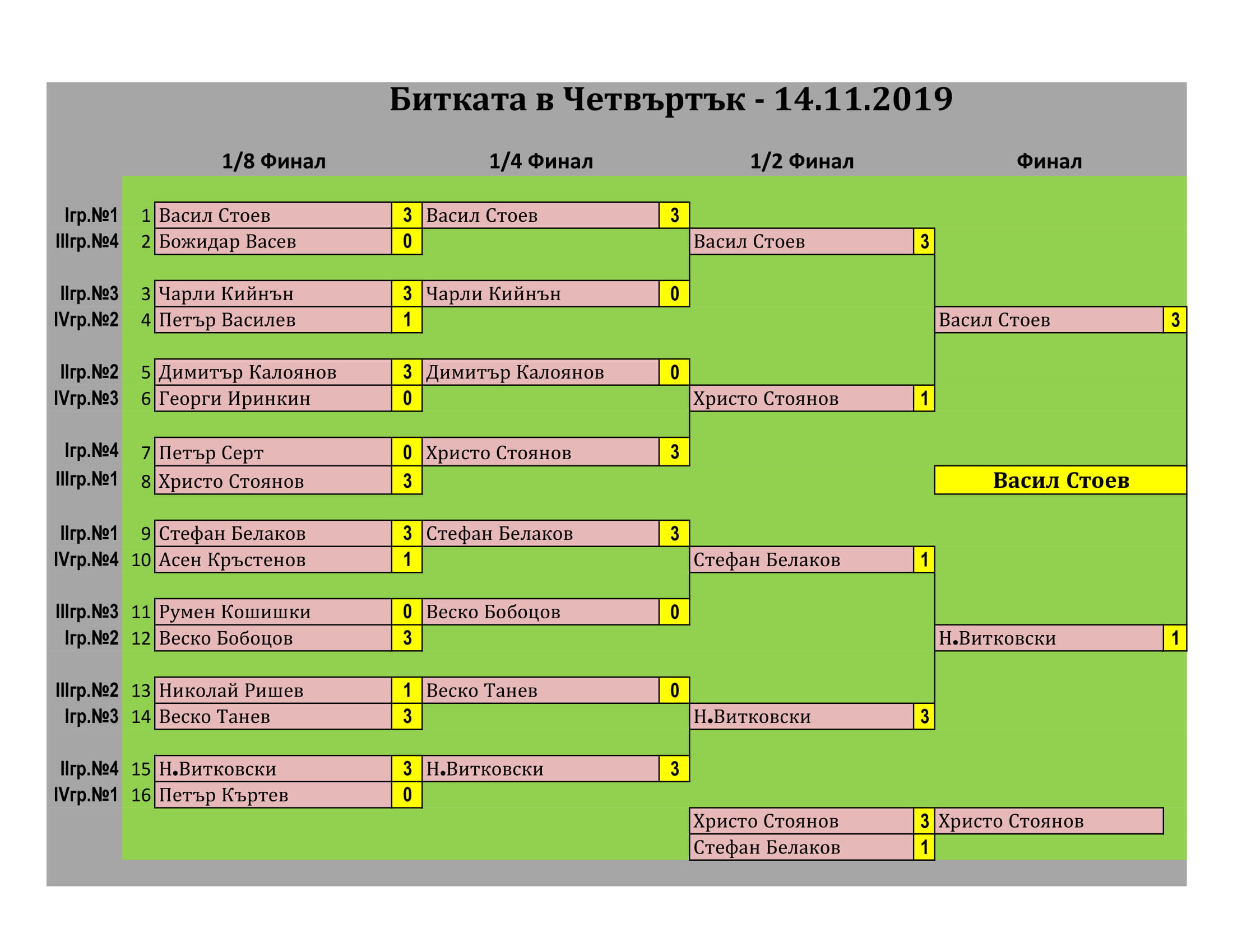 Битката в Четвъртък е състезание, което се провежда ВСЕКИ Четвъртък в залата на клуб КИДО .  Този турнир е предназначен за тези, които определят себе си за по-напреднали в тениса на маса. Както и за тези, които искат да проверят уменията си срещу по-силни опоненти.