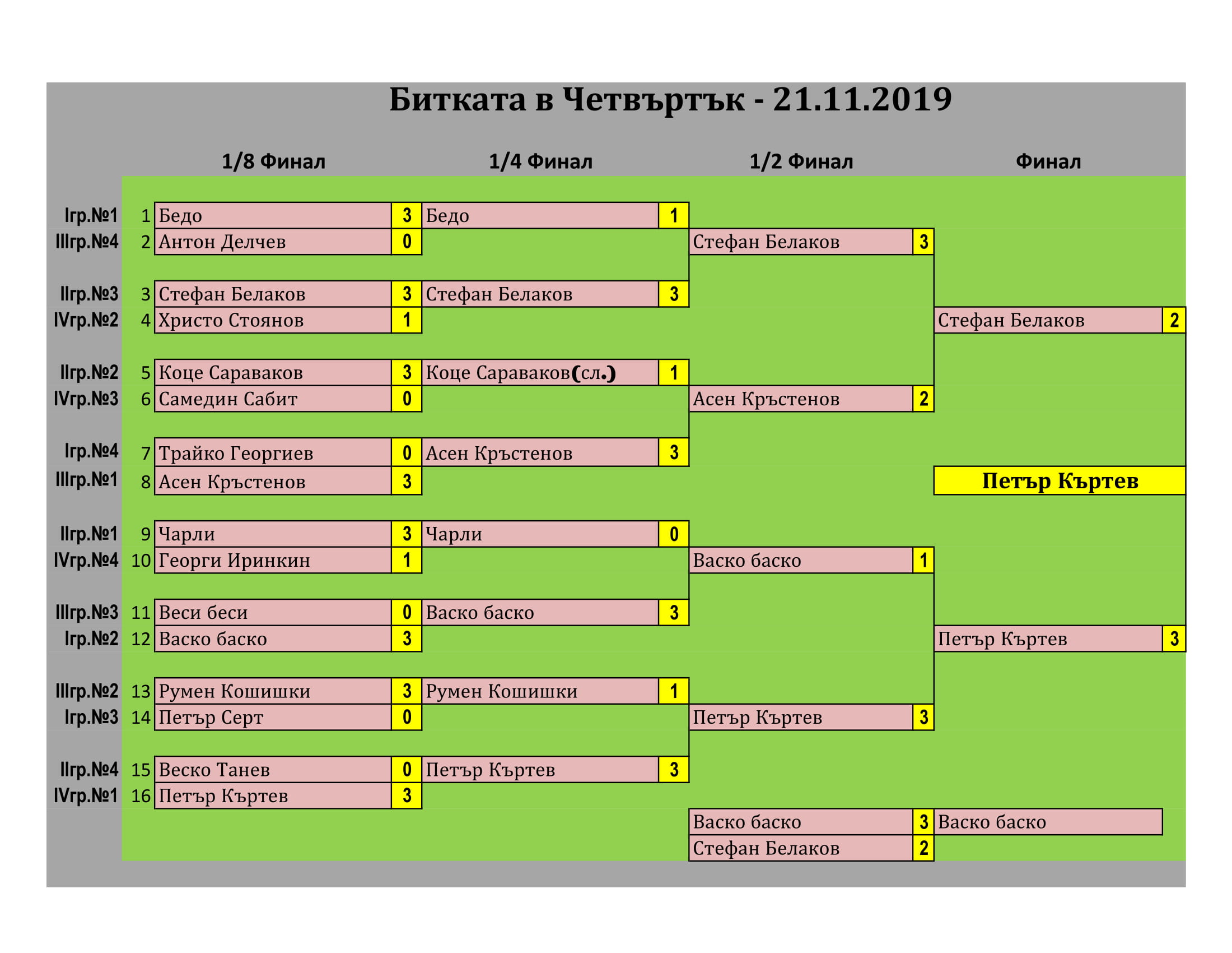 Битката в Четвъртък е състезание, което се провежда ВСЕКИ Четвъртък в залата на клуб КИДО . Този турнир е предназначен за тези, които определят себе си за по-напреднали в тениса на маса. Както и за тези, които искат да проверят уменията си срещу по-силни опоненти.