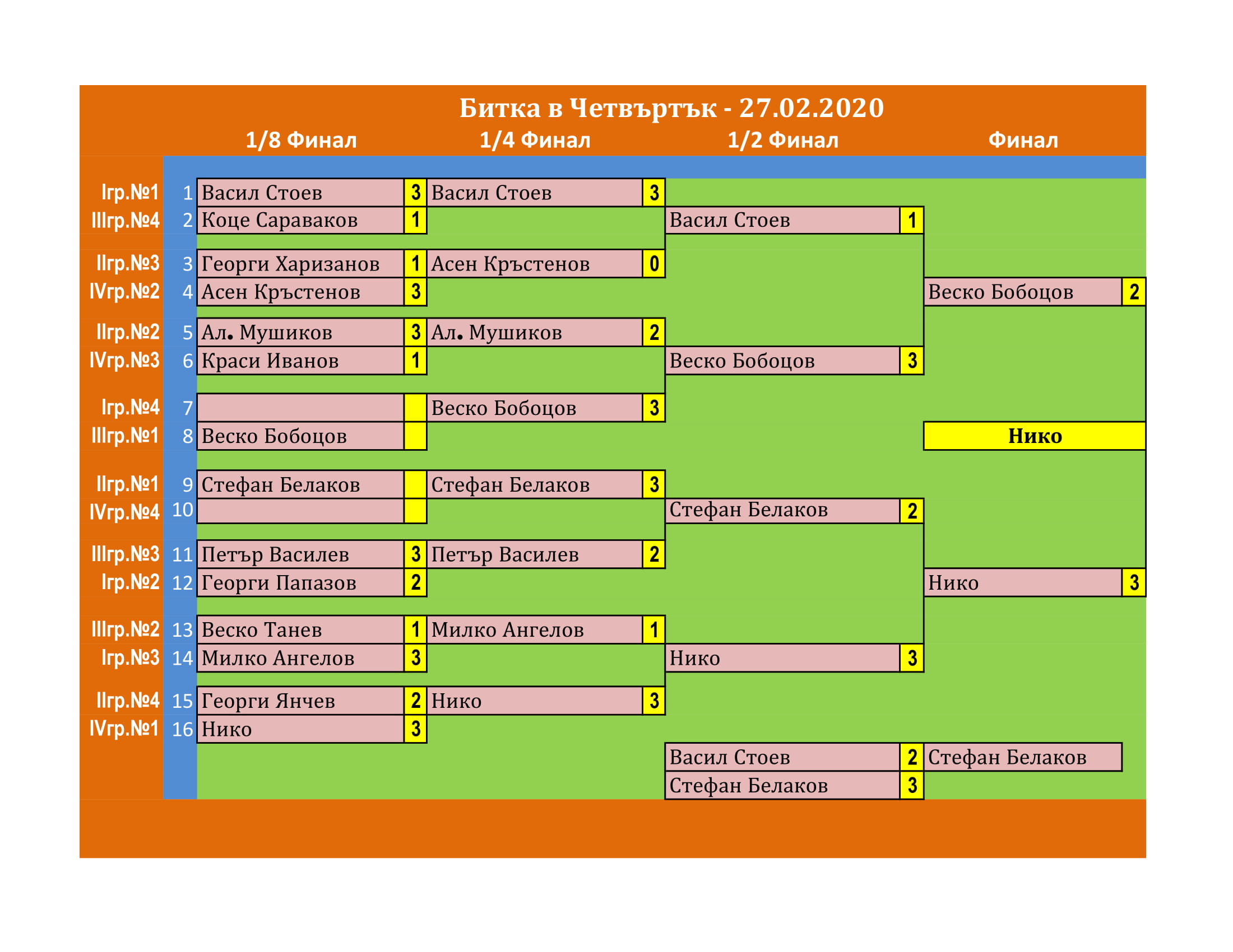 Битката в Четвъртък е състезание, което се провежда ВСЕКИ Четвъртък в залата на клуб КИДО .  Този турнир е предназначен за тези, които определят себе си за по-напреднали в тениса на маса. Както и за тези, които искат да проверят уменията си срещу по-силни опоненти.