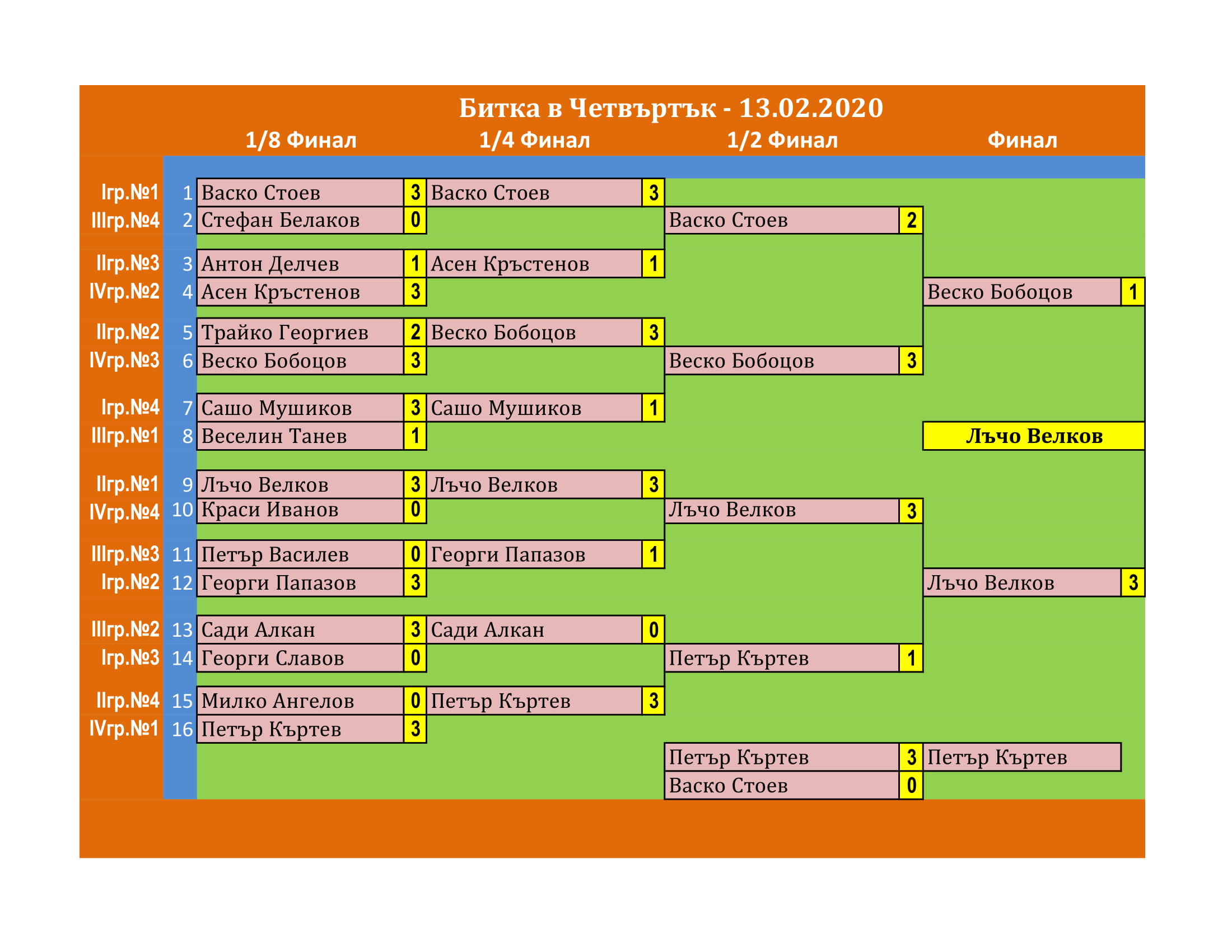 Битката в Четвъртък е състезание, което се провежда ВСЕКИ Четвъртък в залата на клуб КИДО . Този турнир е предназначен за тези, които определят себе си за по-напреднали в тениса на маса. Както и за тези, които искат да проверят уменията си срещу по-силни опоненти.