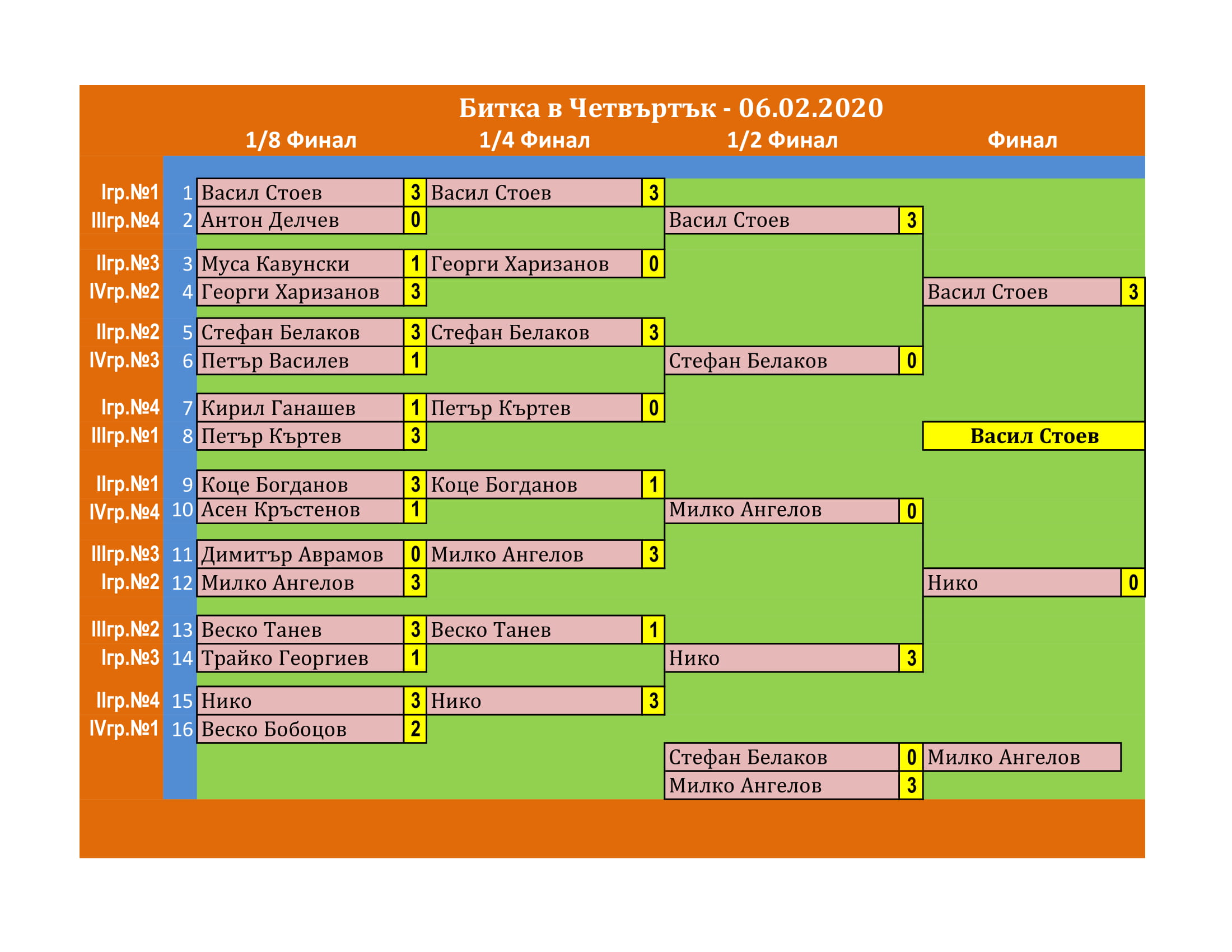 Битката в Четвъртък е състезание, което се провежда ВСЕКИ Четвъртък в залата на клуб КИДО .  Този турнир е предназначен за тези, които определят себе си за по-напреднали в тениса на маса. Както и за тези, които искат да проверят уменията си срещу по-силни опоненти.