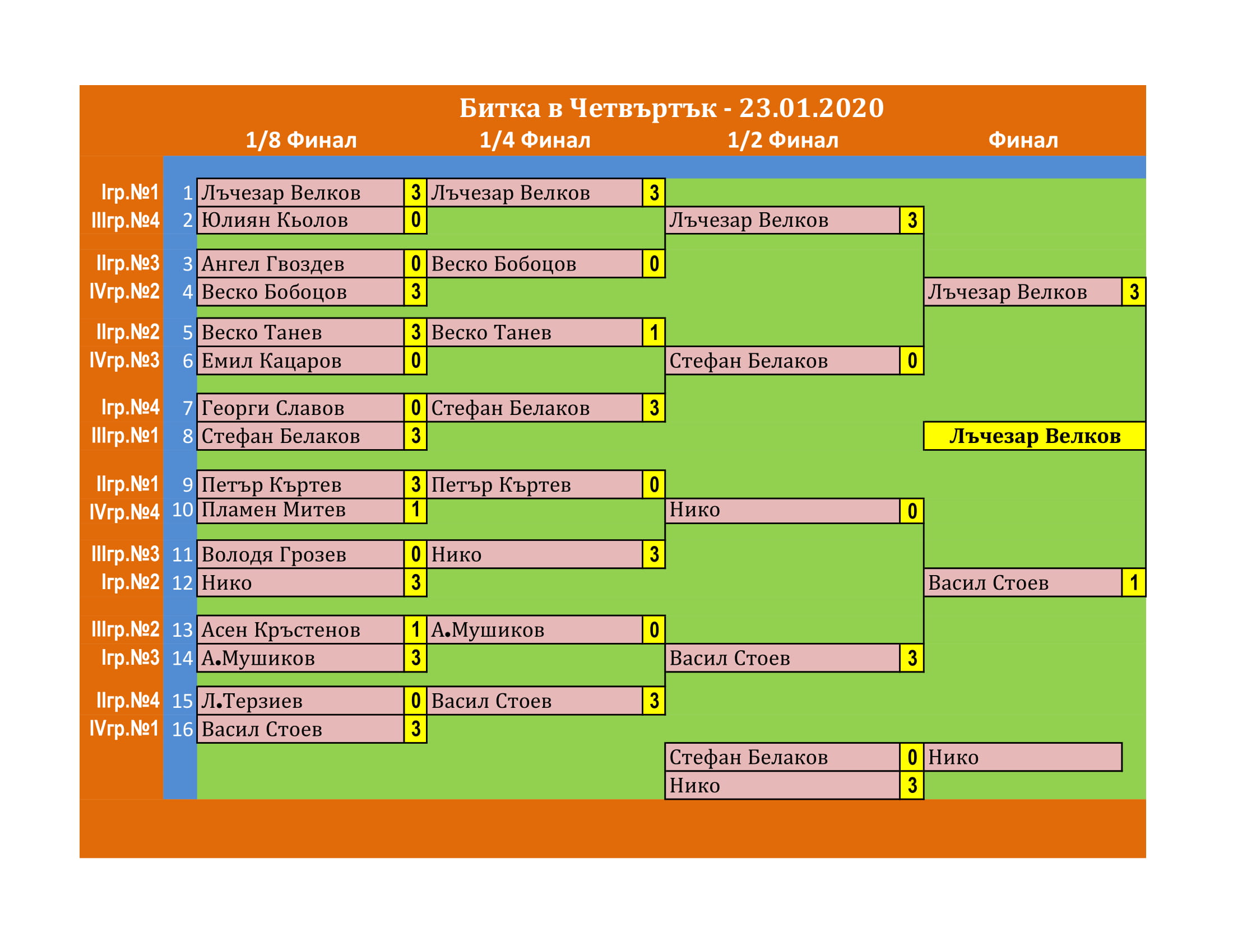 Битката в Четвъртък е състезание, което се провежда ВСЕКИ Четвъртък в залата на клуб КИДО .  Този турнир е предназначен за тези, които определят себе си за по-напреднали в тениса на маса. Както и за тези, които искат да проверят уменията си срещу по-силни опоненти.