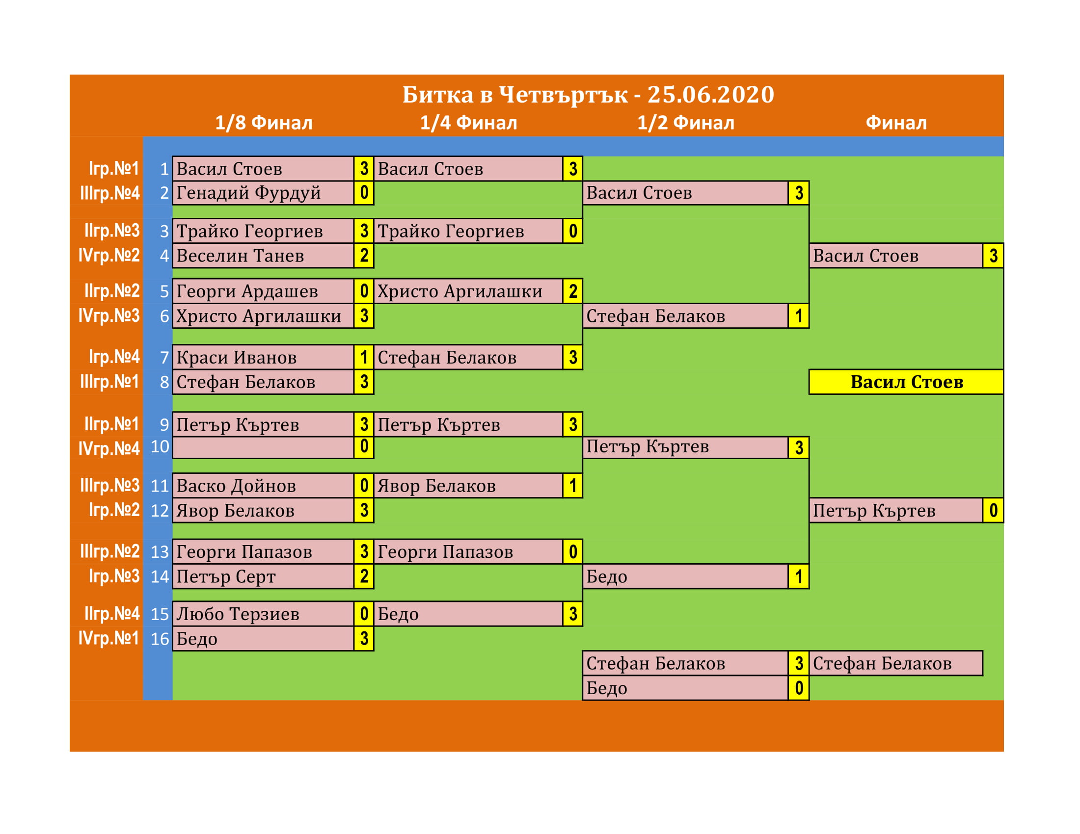 Битката в Четвъртък е състезание, което се провежда ВСЕКИ Четвъртък в залата на клуб КИДО . Този турнир е предназначен за тези, които определят себе си за по-напреднали в тениса на маса. Както и за тези, които искат да проверят уменията си срещу по-силни опоненти.