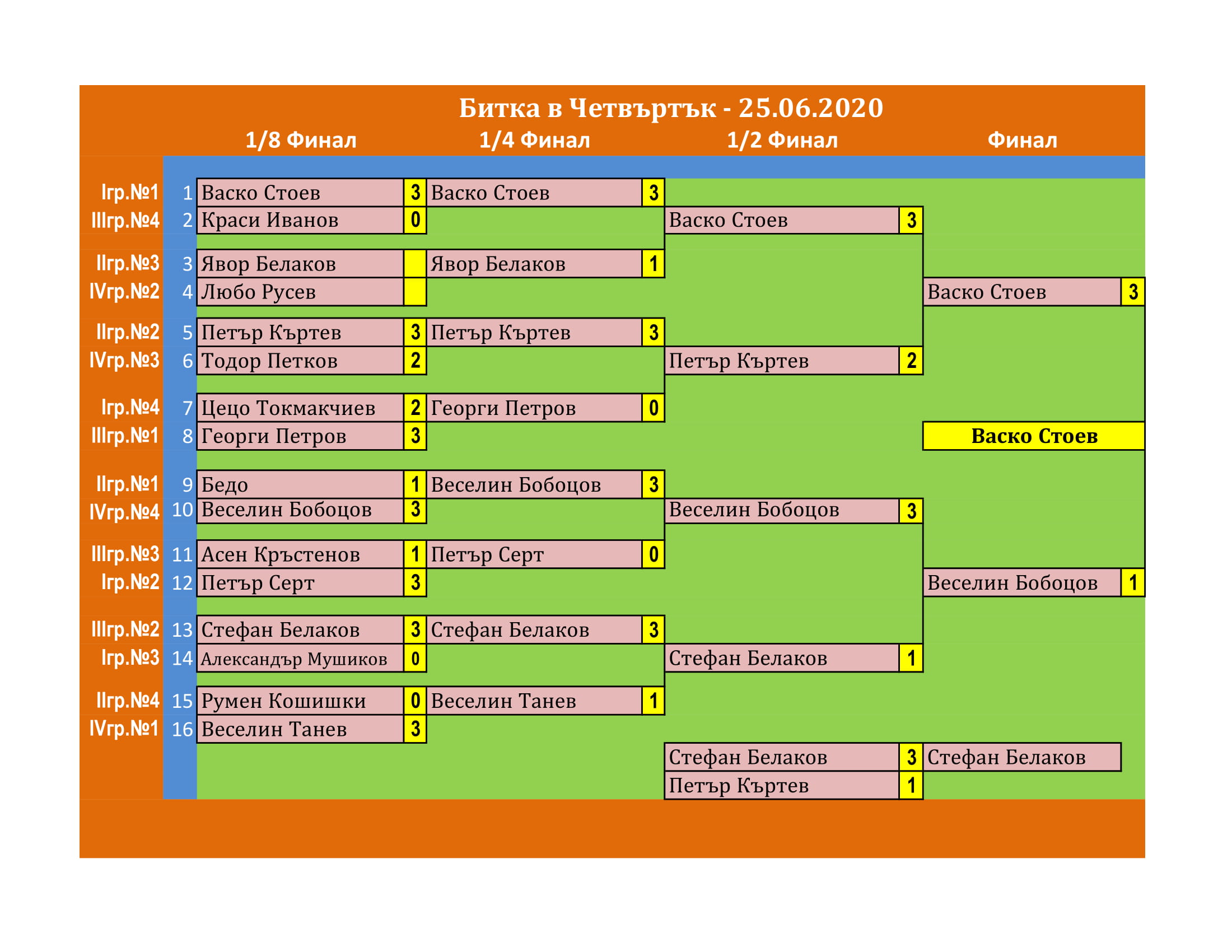 Битката в Четвъртък е състезание, което се провежда ВСЕКИ Четвъртък в залата на клуб КИДО .  Този турнир е предназначен за тези, които определят себе си за по-напреднали в тениса на маса. Както и за тези, които искат да проверят уменията си срещу по-силни опоненти.