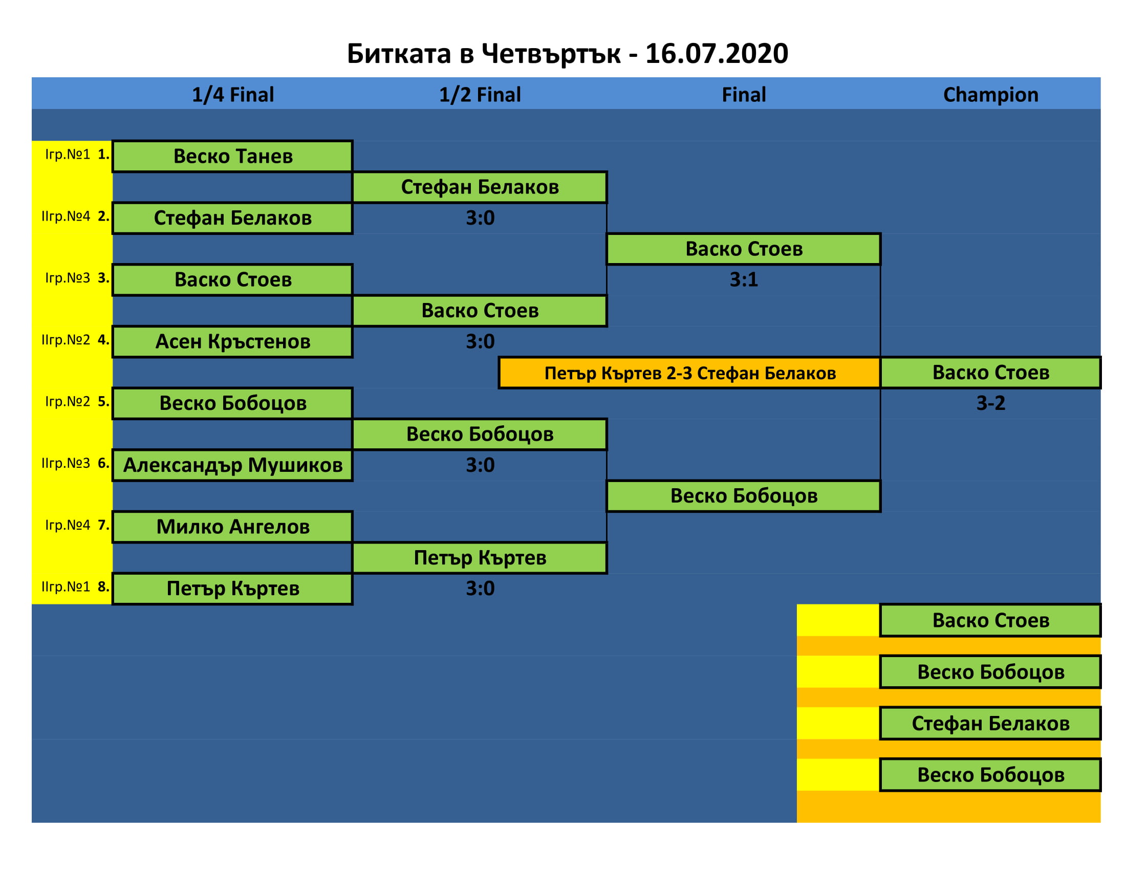 Битката в Четвъртък е състезание, което се провежда ВСЕКИ Четвъртък в залата на клуб КИДО . Този турнир е предназначен за тези, които определят себе си за по-напреднали в тениса на маса. Както и за тези, които искат да проверят уменията си срещу по-силни опоненти.