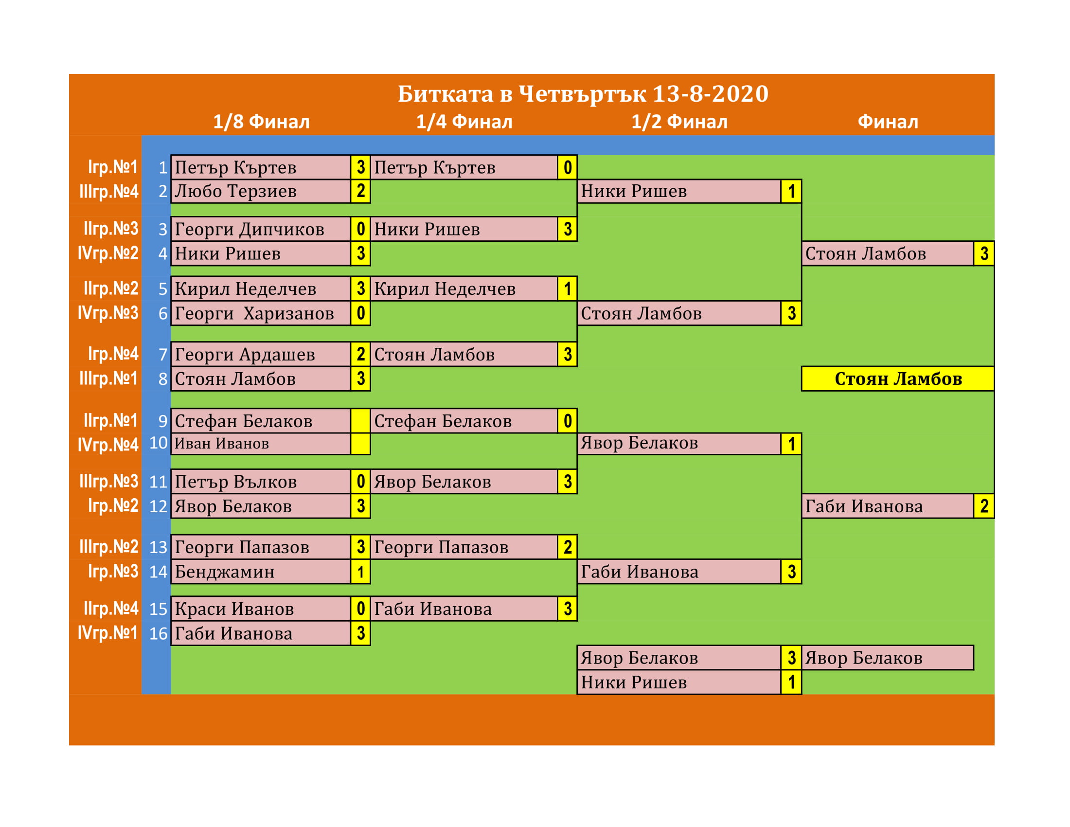 Битката в Четвъртък е състезание, което се провежда ВСЕКИ Четвъртък в залата на клуб КИДО . Този турнир е предназначен за тези, които определят себе си за по-напреднали в тениса на маса. Както и за тези, които искат да проверят уменията си срещу по-силни опоненти.