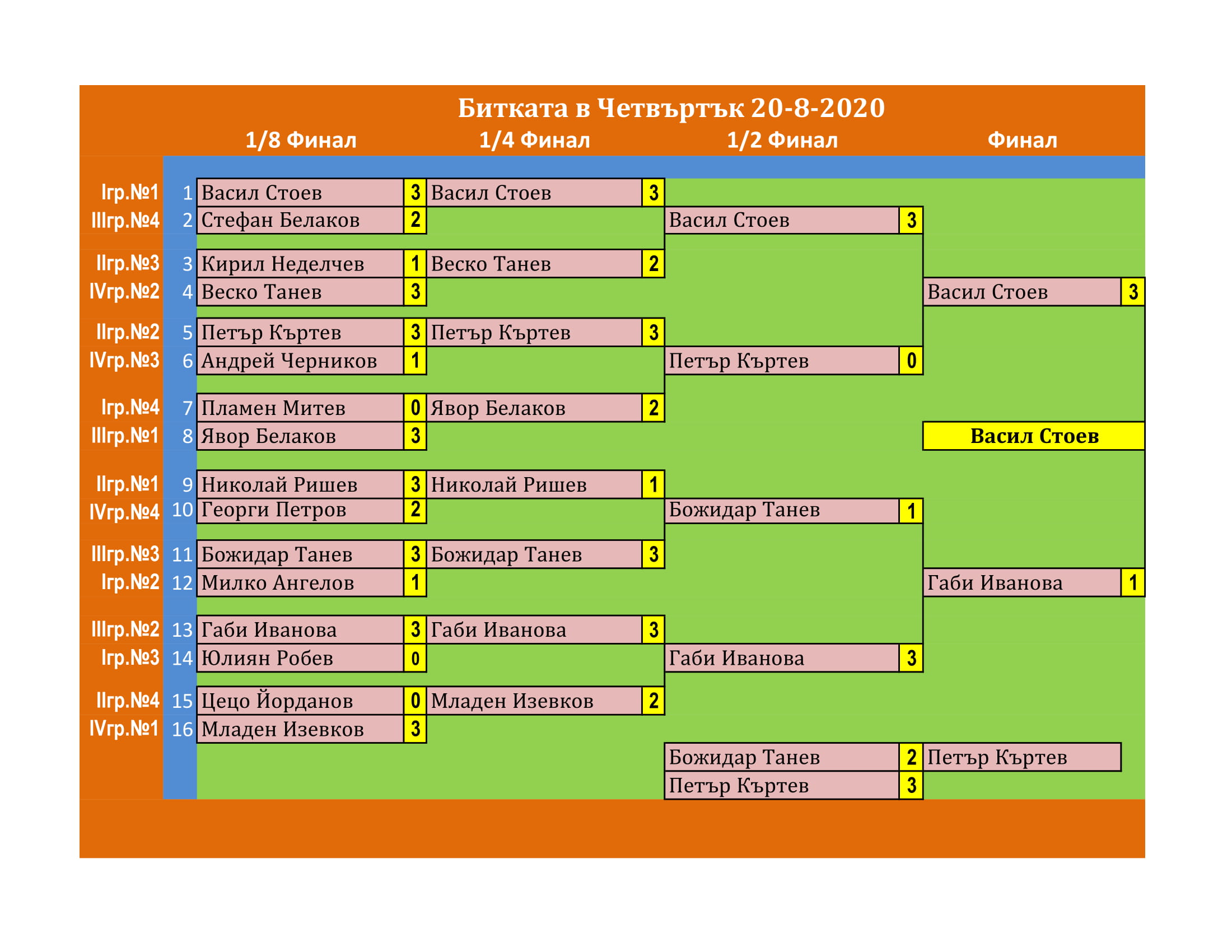 Битката в Четвъртък е състезание, което се провежда ВСЕКИ Четвъртък в залата на клуб КИДО . Този турнир е предназначен за тези, които определят себе си за по-напреднали в тениса на маса. Както и за тези, които искат да проверят уменията си срещу по-силни опоненти.