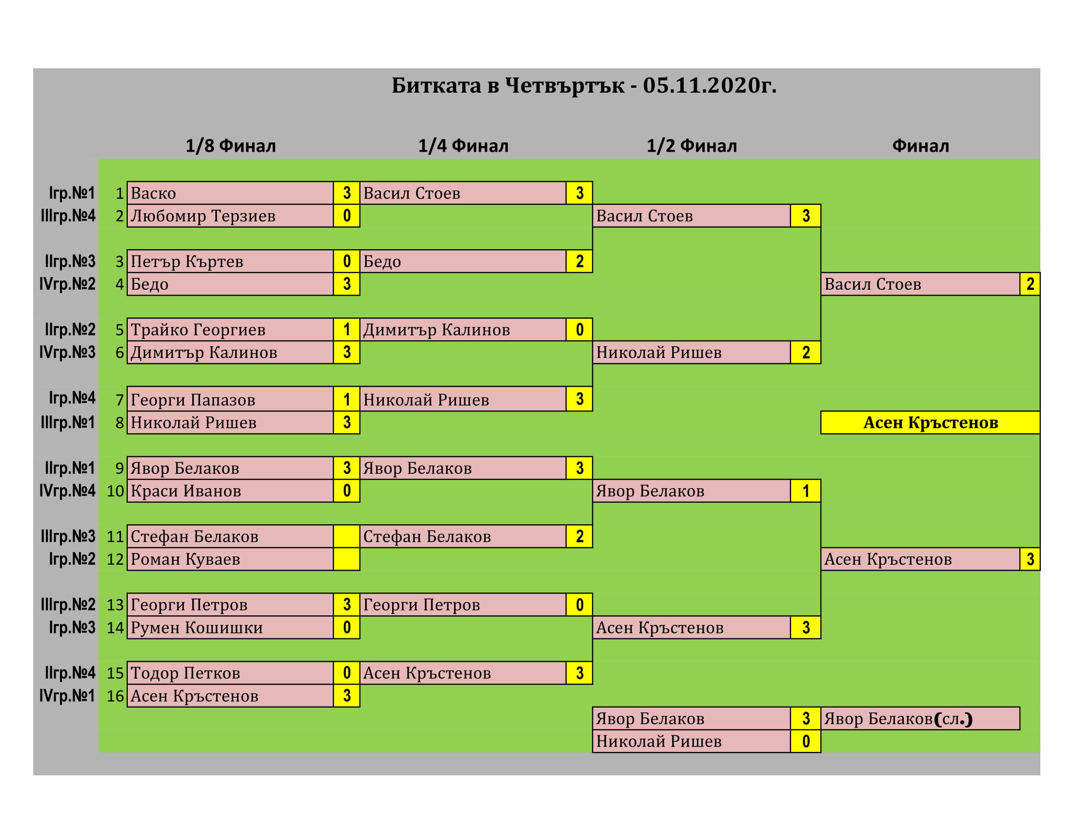 Битката в Четвъртък е състезание, което се провежда ВСЕКИ Четвъртък в залата на клуб КИДО . Този турнир е предназначен за тези, които определят себе си за по-напреднали в тениса на маса. Както и за тези, които искат да проверят уменията си срещу по-силни опоненти.