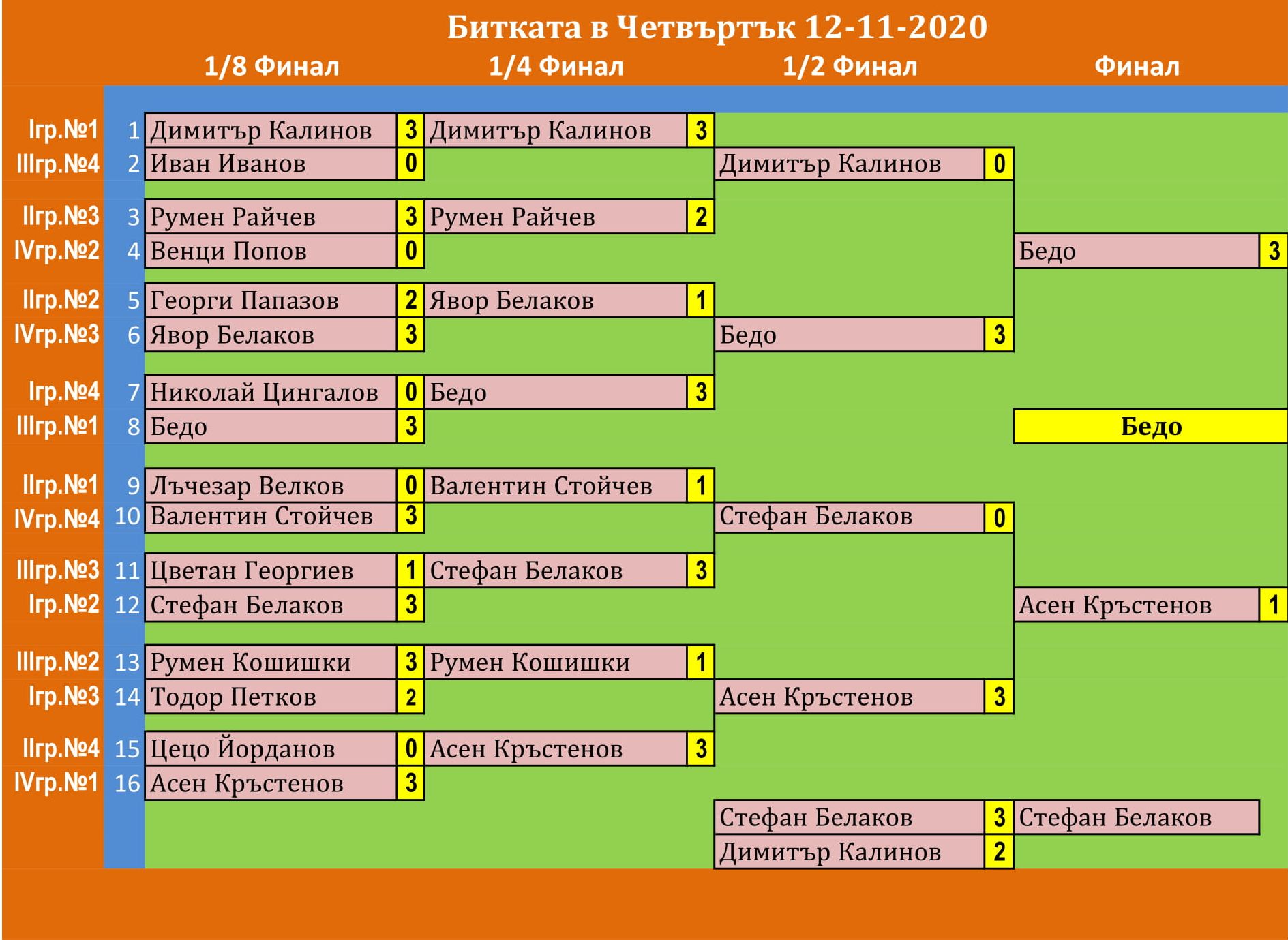 Битката в Четвъртък е състезание, което се провежда ВСЕКИ Четвъртък в залата на клуб КИДО . Този турнир е предназначен за тези, които определят себе си за по-напреднали в тениса на маса. Както и за тези, които искат да проверят уменията си срещу по-силни опоненти.