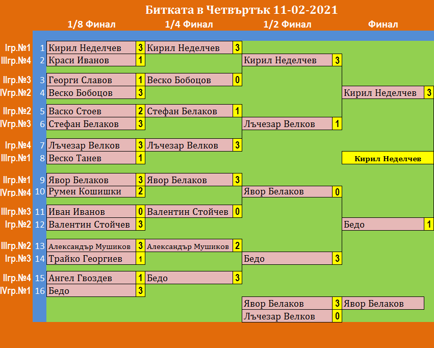 Битката в Четвъртък е състезание, което се провежда ВСЕКИ Четвъртък в залата на клуб КИДО . Този турнир е предназначен за тези, които определят себе си за по-напреднали в тениса на маса. Както и за тези, които искат да проверят уменията си срещу по-силни опоненти.