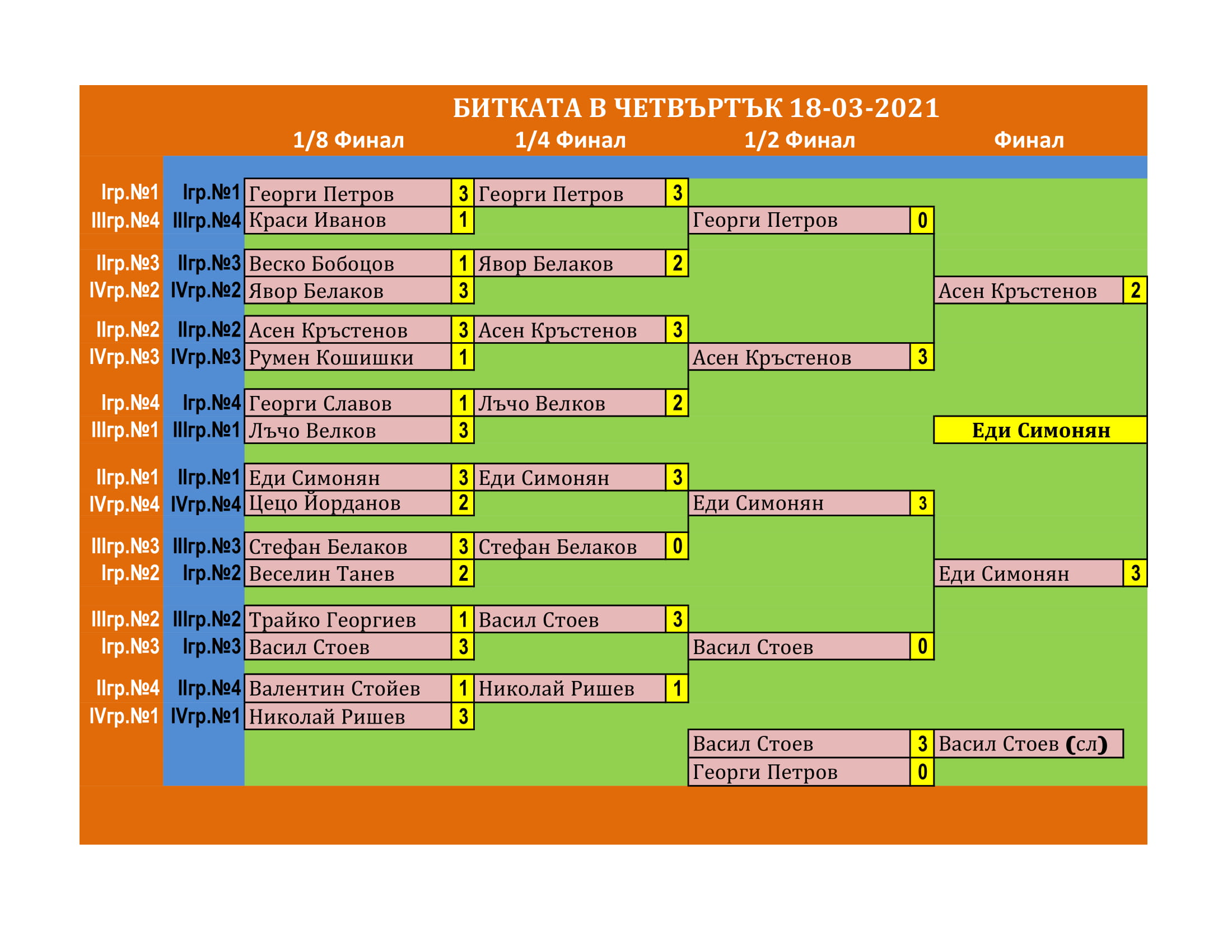 Битката в Четвъртък е състезание, което се провежда ВСЕКИ Четвъртък в залата на клуб КИДО .  Този турнир е предназначен за тези, които определят себе си за по-напреднали в тениса на маса. Както и за тези, които искат да проверят уменията си срещу по-силни опоненти.