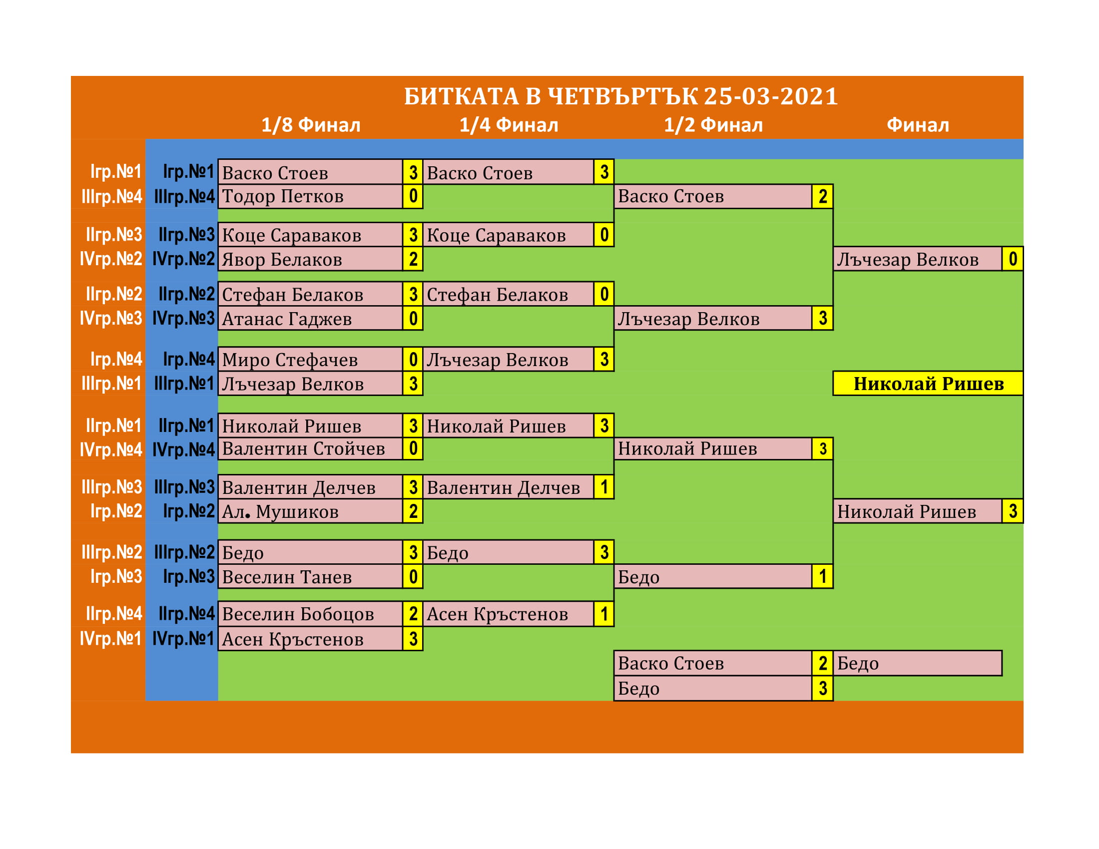 Битката в Четвъртък е състезание, което се провежда ВСЕКИ Четвъртък в залата на клуб КИДО . Този турнир е предназначен за тези, които определят себе си за по-напреднали в тениса на маса. Както и за тези, които искат да проверят уменията си срещу по-силни опоненти.