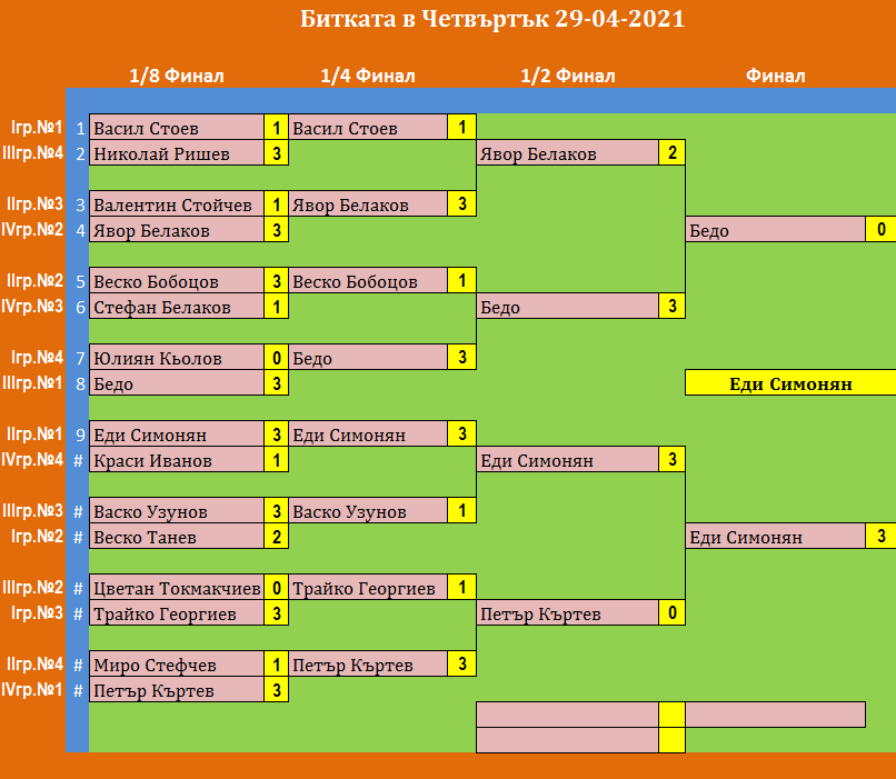 Битката в Четвъртък е състезание, което се провежда ВСЕКИ Четвъртък в залата на клуб КИДО . Този турнир е предназначен за тези, които определят себе си за по-напреднали в тениса на маса. Както и за тези, които искат да проверят уменията си срещу по-силни опоненти.