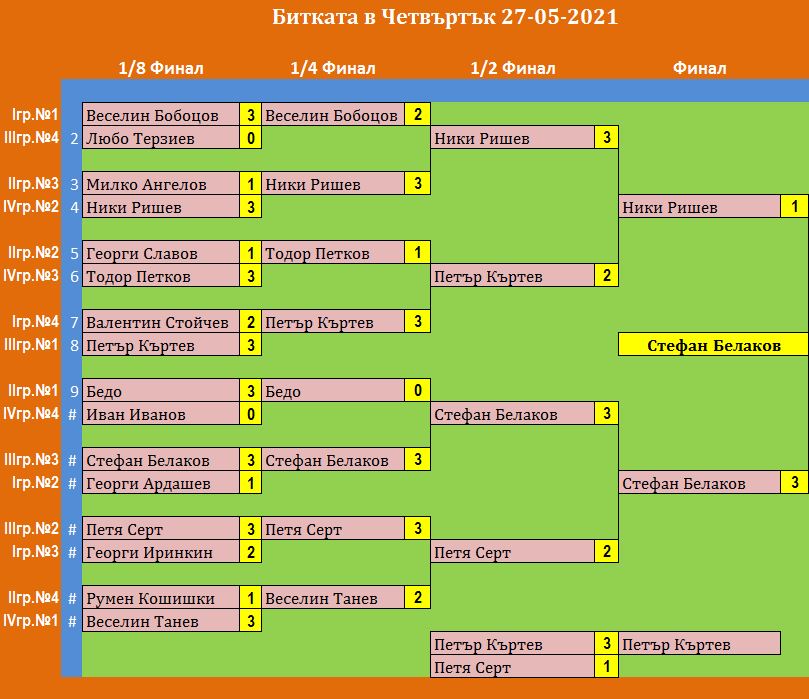 Битката в Четвъртък е състезание, което се провежда ВСЕКИ Четвъртък в залата на клуб КИДО .  Този турнир е предназначен за тези, които определят себе си за по-напреднали в тениса на маса. Както и за тези, които искат да проверят уменията си срещу по-силни опоненти.