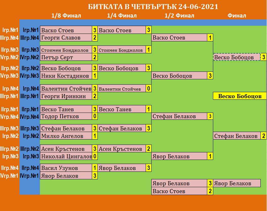 Битката в Четвъртък е състезание, което се провежда ВСЕКИ Четвъртък в залата на клуб КИДО . Този турнир е предназначен за тези, които определят себе си за по-напреднали в тениса на маса. Както и за тези, които искат да проверят уменията си срещу по-силни опоненти.
