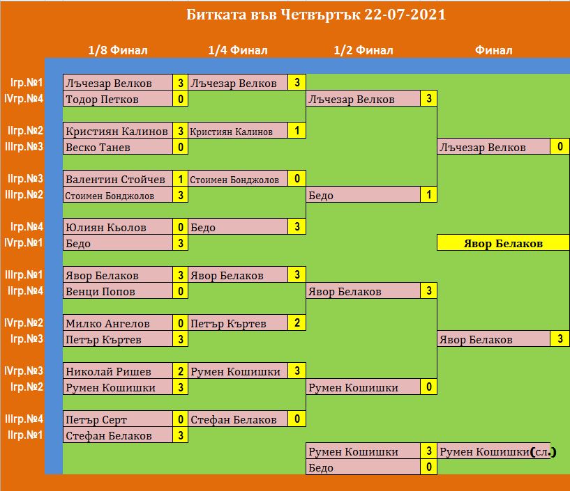 Битката в Четвъртък е състезание, което се провежда ВСЕКИ Четвъртък в залата на клуб КИДО . Този турнир е предназначен за тези, които определят себе си за по-напреднали в тениса на маса. Както и за тези, които искат да проверят уменията си срещу по-силни опоненти.