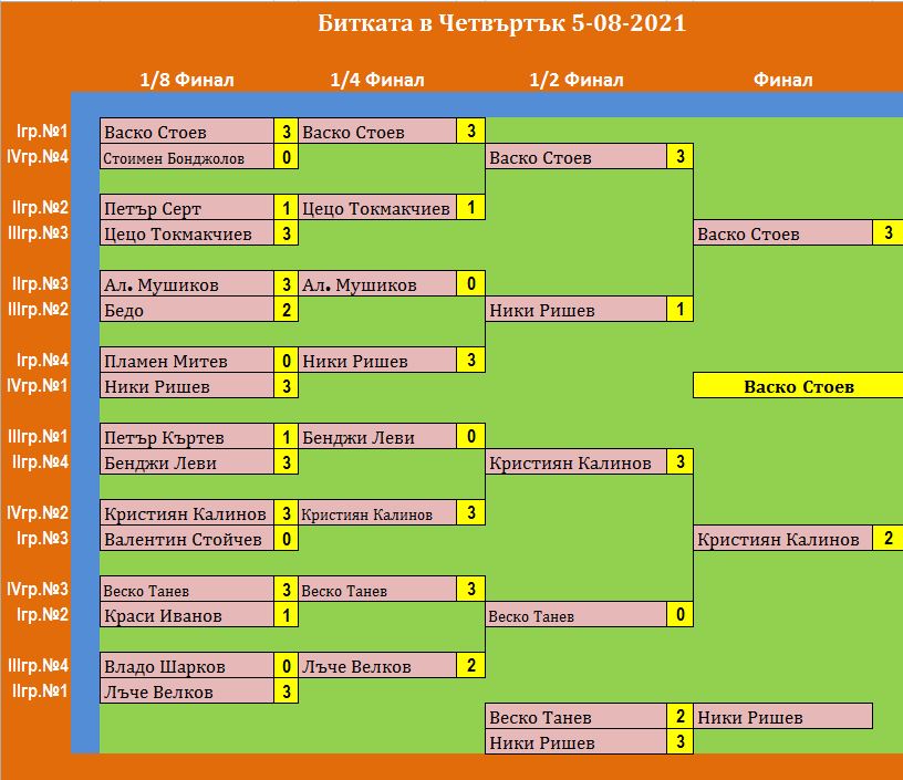 Битката в Четвъртък е състезание, което се провежда ВСЕКИ Четвъртък в залата на клуб КИДО . Този турнир е предназначен за тези, които определят себе си за по-напреднали в тениса на маса. Както и за тези, които искат да проверят уменията си срещу по-силни опоненти.