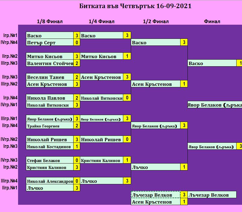 Битката в Четвъртък е състезание, което се провежда ВСЕКИ Четвъртък в залата на клуб КИДО .  Този турнир е предназначен за тези, които определят себе си за по-напреднали в тениса на маса. Както и за тези, които искат да проверят уменията си срещу по-силни опоненти.