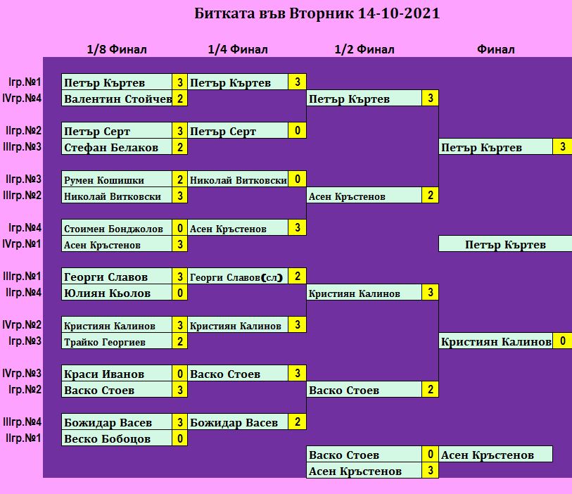 Битката в Четвъртък е състезание, което се провежда ВСЕКИ Четвъртък в залата на клуб КИДО .  Този турнир е предназначен за тези, които определят себе си за по-напреднали в тениса на маса. Както и за тези, които искат да проверят уменията си срещу по-силни опоненти.