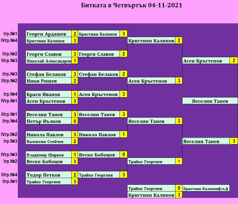 Битката в Четвъртък е състезание, което се провежда ВСЕКИ Четвъртък в залата на клуб КИДО . Този турнир е предназначен за тези, които определят себе си за по-напреднали в тениса на маса. Както и за тези, които искат да проверят уменията си срещу по-силни опоненти.