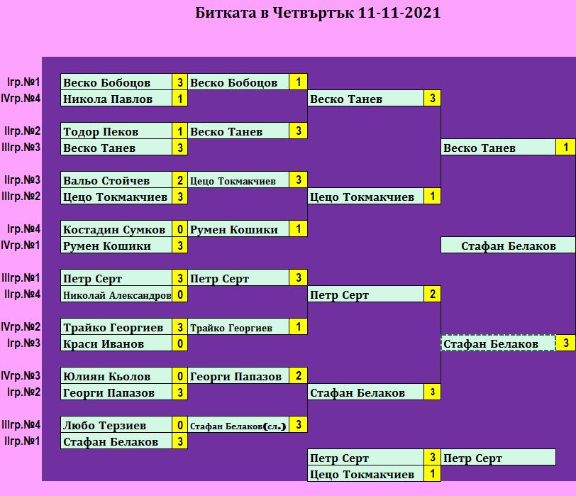 Битката в Четвъртък е състезание, което се провежда ВСЕКИ Четвъртък в залата на клуб КИДО .  Този турнир е предназначен за тези, които определят себе си за по-напреднали в тениса на маса. Както и за тези, които искат да проверят уменията си срещу по-силни опоненти.