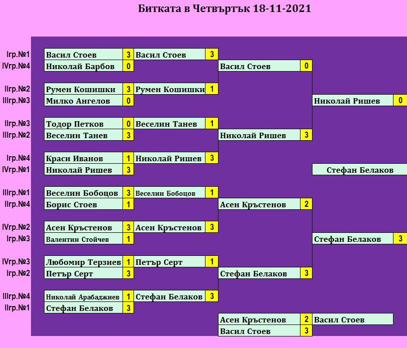 Битката в Четвъртък е състезание, което се провежда ВСЕКИ Четвъртък в залата на клуб КИДО .  Този турнир е предназначен за тези, които определят себе си за по-напреднали в тениса на маса. Както и за тези, които искат да проверят уменията си срещу по-силни опоненти.