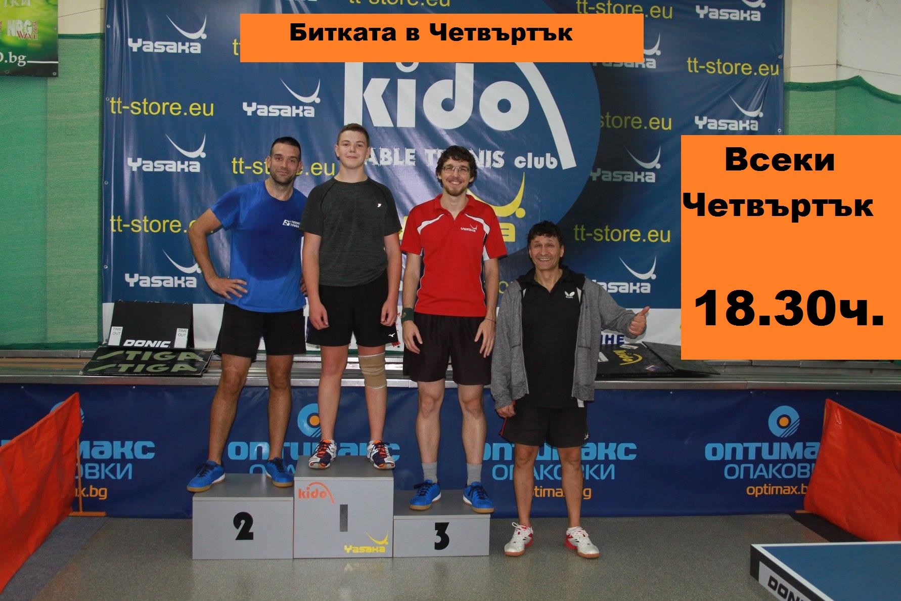 Битката в Четвъртък е състезание, което се провежда ВСЕКИ Четвъртък в залата на клуб КИДО . Този турнир е предназначен за тези, които определят себе си за по-напреднали в тениса на маса. Както и за тези, които искат да проверят уменията си срещу по-силни опоненти.